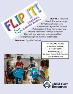 25 Mar Flip It! Transforming Challenging Behavior – May 14, 2026 Zoom Training Posted at 11:44h in Uncategorized by ccradmin 0 Comments 0 Likes